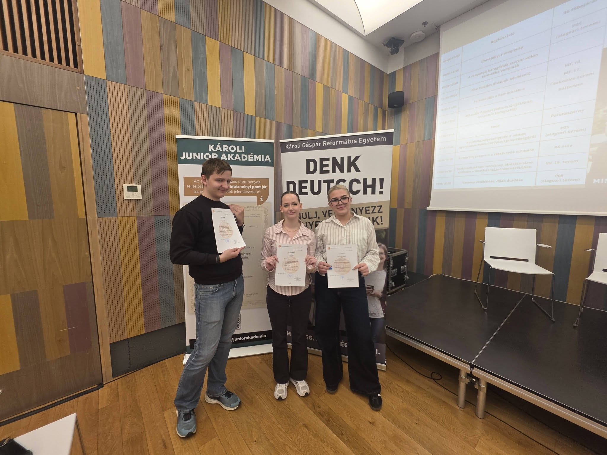 Rabi Fanni Katalin, Erdei Éva és Kiss Balázs 11GA osztályos tanulók országos 1. helyezést értek el a Károli Gáspár Református Egyetem „Denk Deutsch” német nyelvi versenyén haladó kategóriában. Felkészítő tanáraik Nagyné Szarka Ibolya és Kovács Beáta tanárnők voltak. Diákjaink a verseny mindhárom fordulójában kiválóan szerepeltek.
